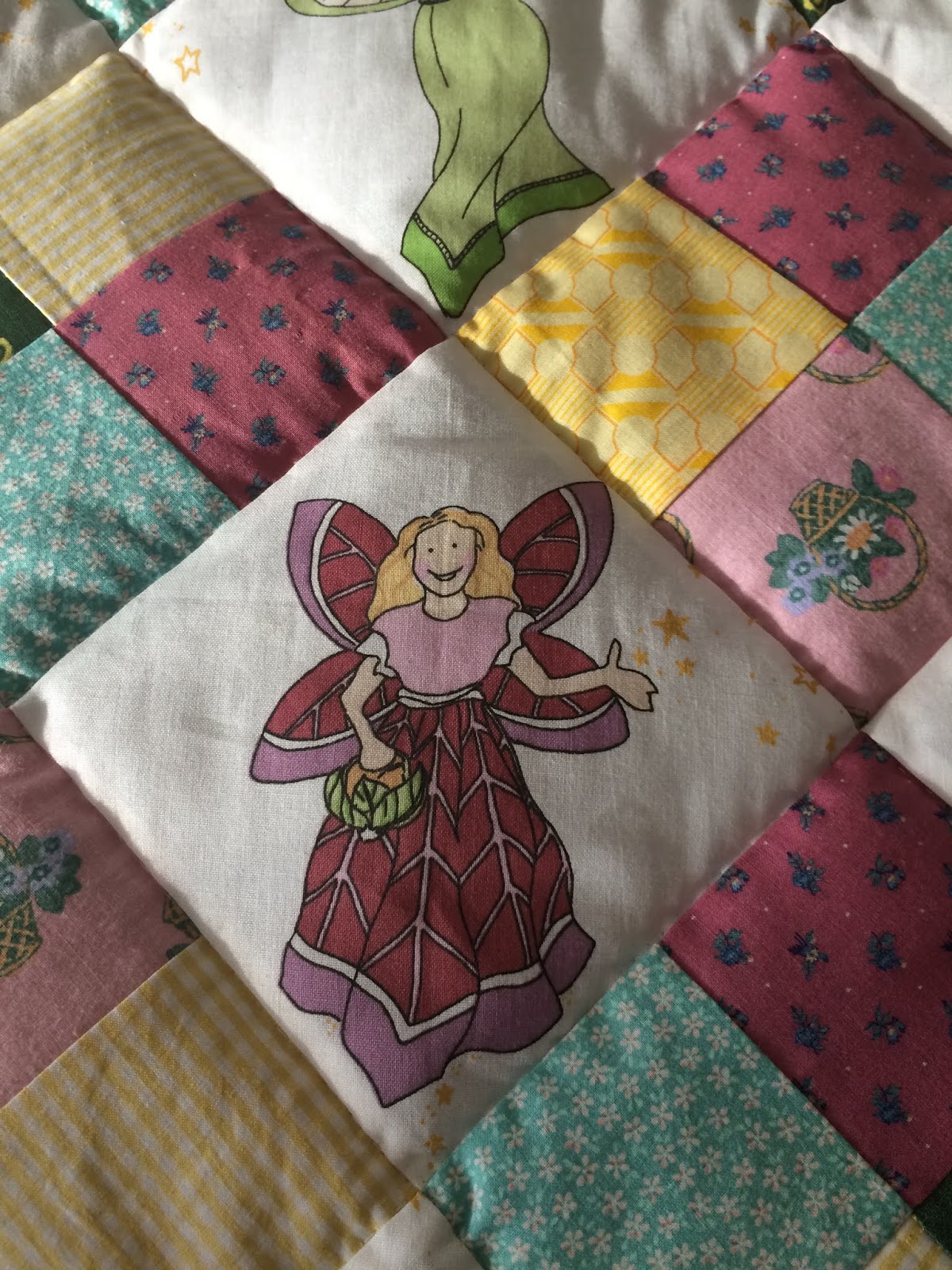 Spalvingos pasakų fėjos saugos ramų mažylės (pamiršau paminėti, kad antklodėlę siuvau mergytei) miegą -Antklodėlė yra 103x85 cm dydžio, viduje sintepono sluoksnis, abi pusės natūralios medvilnės, daigstyta rankomis.
